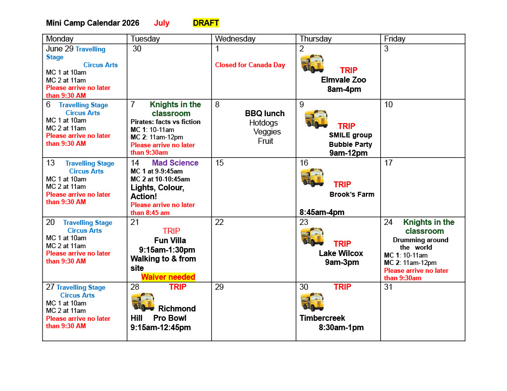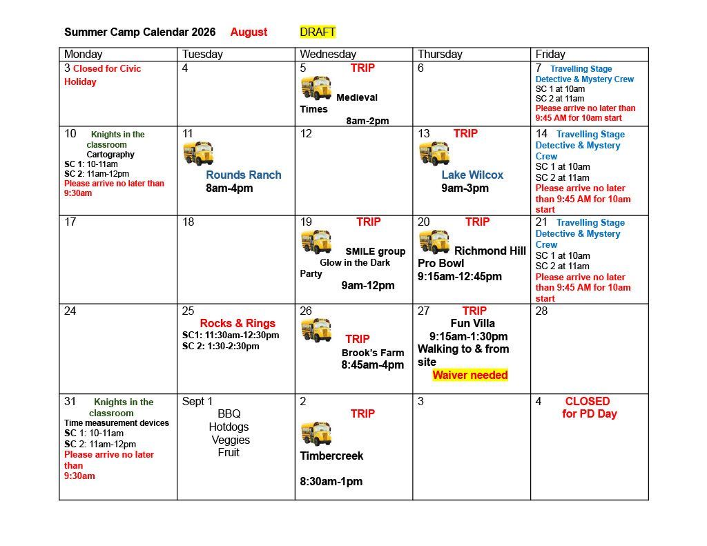 2026 School Age Summer Camp Draft Calendar: